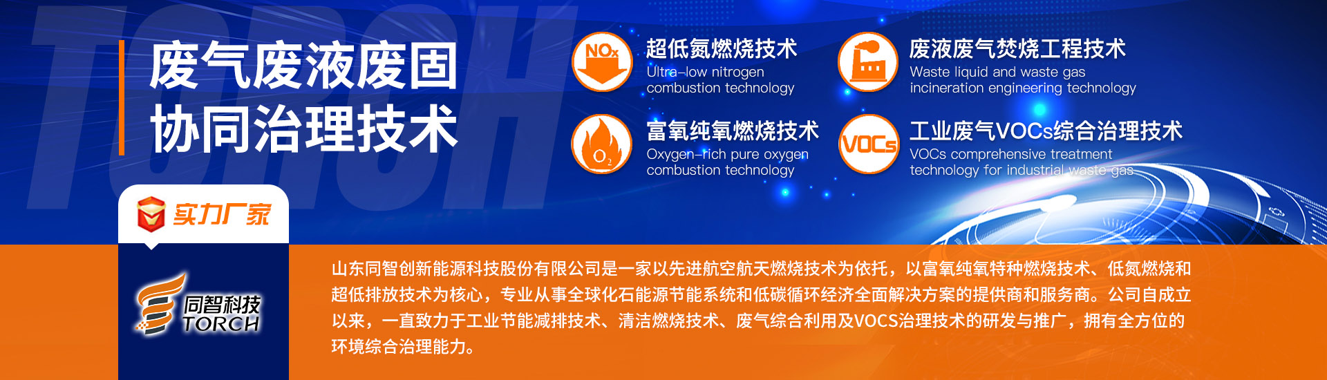 山東同智創新能源科技股份有限公司是一家以先進航空航天燃燒技術為依托,以富氧純氧特種燃燒、低氮燃燒和超低排放技術為核心,專業從事全球化石能源節能系統和低碳循環經濟全面解決方案的提供商和服務商。公司自成立以來,一直致力于工業節能減排技術、清潔燃燒技術、廢氣綜合利用及VOCs治理技術的研發與推廣,擁有國內一流的環境綜合治理能力,是節能環保行業的領導者。